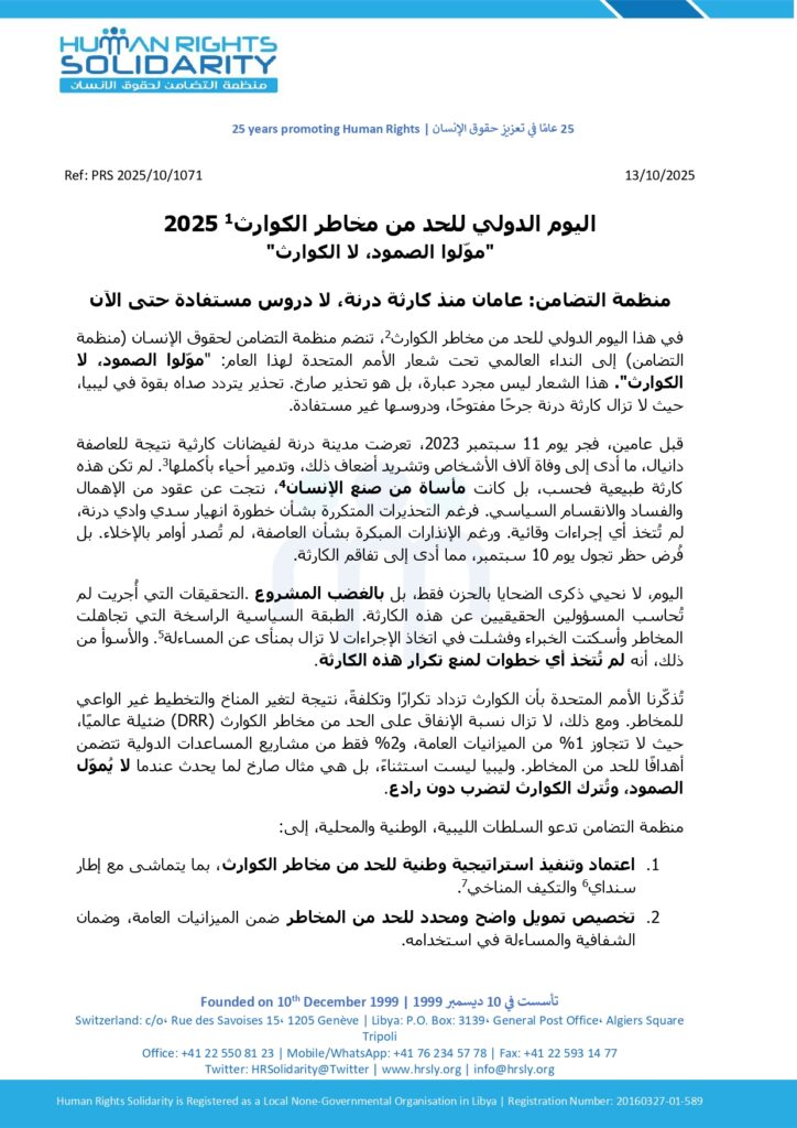 في هذا اليوم الدولي للحد من مخاطر الكوارث[2]، تنضم منظمة التضامن لحقوق الإنسان (منظمة التضامن) إلى النداء العالمي تحت شعار الأمم المتحدة لهذا العام: “موّلوا الصمود، لا الكوارث”. هذا الشعار ليس مجرد عبارة، بل هو تحذير صارخ. تحذير يتردد صداه بقوة في ليبيا، حيث لا تزال كارثة درنة جرحًا مفتوحًا، ودروسها غير مستفادة.