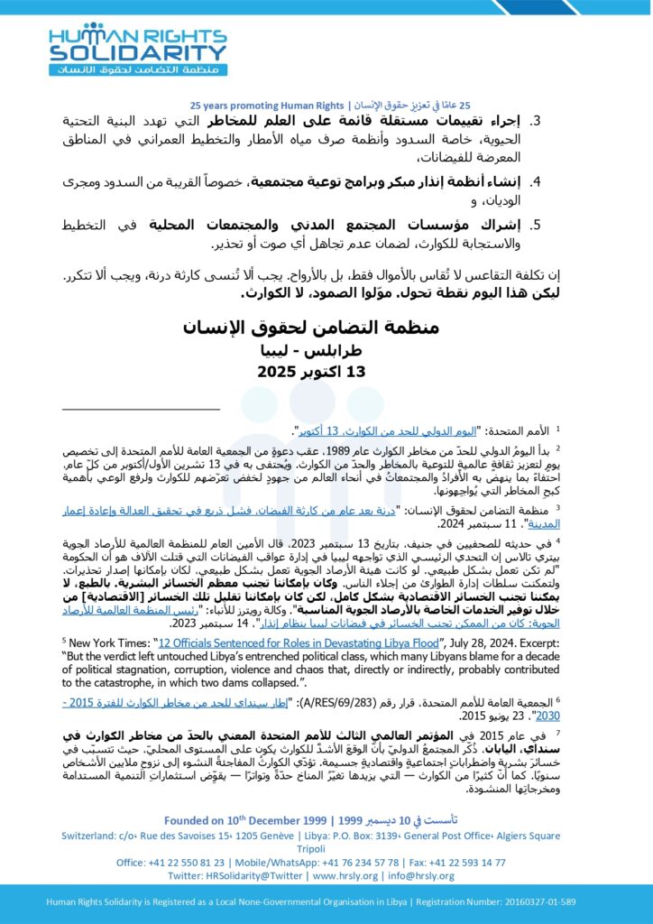 [3] منظمة التضامن لحقوق الإنسان: “درنة بعد عام من كارثة الفيضان، فشل ذريع في تحقيق العدالة وإعادة إعمار المدينة“، 11 سبتمبر 2024.