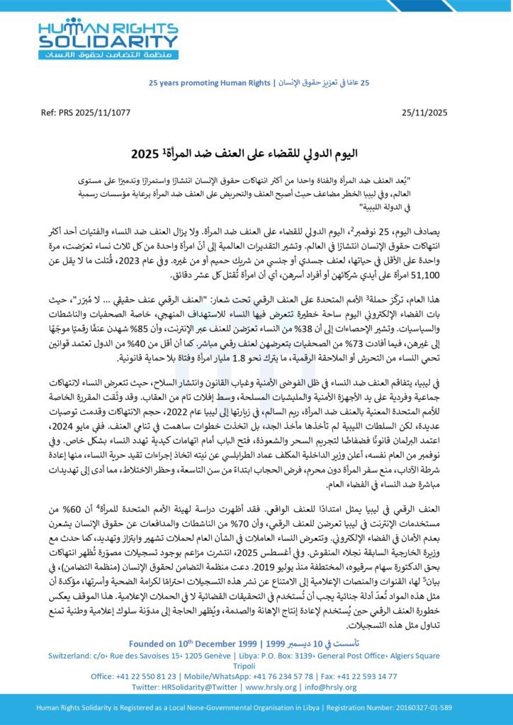 “يُعد العنف ضد المرأة والفتاة واحدا من أكثر انتهاكات حقوق الإنسان انتشارًا واستمرارًا وتدميرًا على مستوى العالم، وفي ليبيا الخطر مضاعف حيث أصبح العنف والتحريض على العنف ضد المرأة برعاية مؤسسات رسمية في الدولة الليبية”