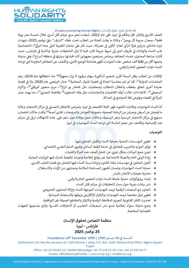 [viii] “عين ليبيا”: “مصادر أمنية في مدينة مصراتة: تم العثور على جثمان الطبيبة أماني جحا بعد نحو أسبوع من اختفائها“، 17 نوفمبر 2025.