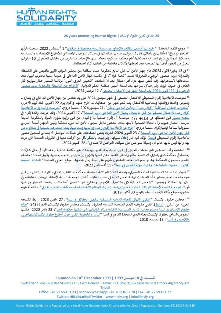 [xv] تعرضت الإعلامية إكرام السعيطي للاعتقال التعسفي في شهر سبتمبر 2024 على يد عناصر من جهاز الأمن الداخلي في بنغازي، وتعرض والدها ووالدتها ومحاميها للاعتقال بعد نحو شهر من اعتقالها، ثم أفرج عنهم وإكرام يوم 22 أكتوبر. قناة ليبيا الأحرار: “بنغازي.. اعتقال المواطنة “إكرام رجب”، والأمن الداخلي يحذّر“، 21 سبتمبر 2024. منصة دروج: “تعرضت والدة ووالد الإعلامية إكرام رجب للاعتقال تعسفياً من قبل ما يعرف بجهاز الأمن الداخلي سيء السمعة“، 17 أكتوبر 2024. وقد خرجت والدة إكرام في مقطع مصوّر قبل اعتقالها هي وزوجها بأيام، موضحة أن إكرام ضحية بلاغ كيدي من قبل وزيرة شؤون المرأة بالحكومة التابعة للبرلمان انتصار عبود، وأن الحالة الصحية لابنتها بدأت تتدهور داخل سجون الأمن الداخلي، مُحمِّلة رئيس الجهاز أسامة الدرسي مسؤولية سلامة ابنتها إكرام. منصة دروج: “أُفرِج عن الإعلامية إكرام رجب ووالديها ومحاميها، بعد احتجازهم تعسفياً في بنغازي، من قبل جهاز الأمن الداخلي سيء السمعة“، 23 أكتوبر 2024. نشرت بعض الصفحات على شبكات التواصل الاجتماعي تسجيل مصور للإعلامية إكرام السعيطي (رابط) تؤكد فيه خبر إخلاء سبيلها، وتوجهت بالشكر لكل من “وقف معها في الظروف الصعبة التي مرت بها، وأنها ليس لديها حاليا أي وسيلة للتواصل على شبكات التواصل الاجتماعي”، 28 أكتوبر 2024.