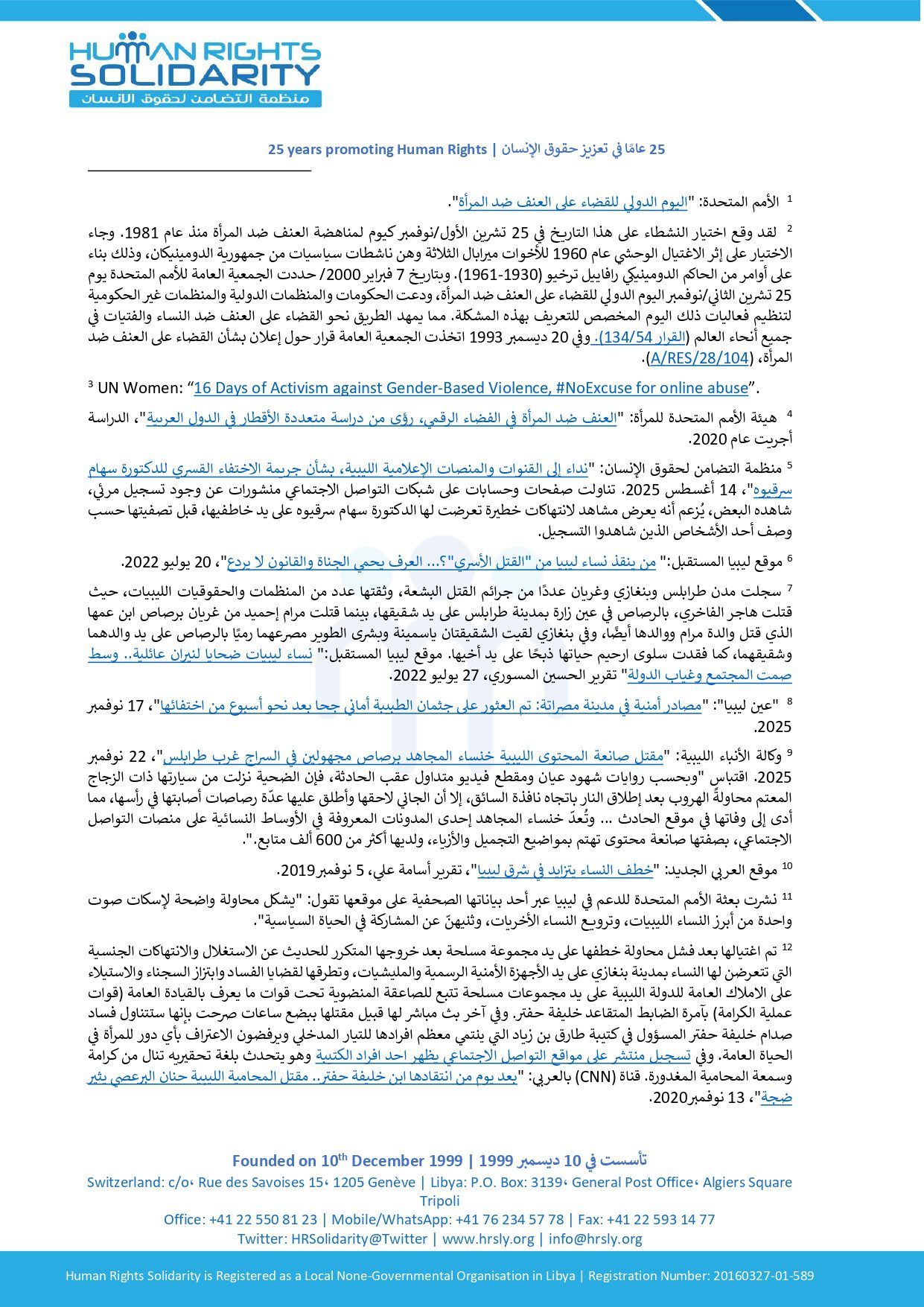 [viii] “عين ليبيا”: “مصادر أمنية في مدينة مصراتة: تم العثور على جثمان الطبيبة أماني جحا بعد نحو أسبوع من اختفائها“، 17 نوفمبر 2025.