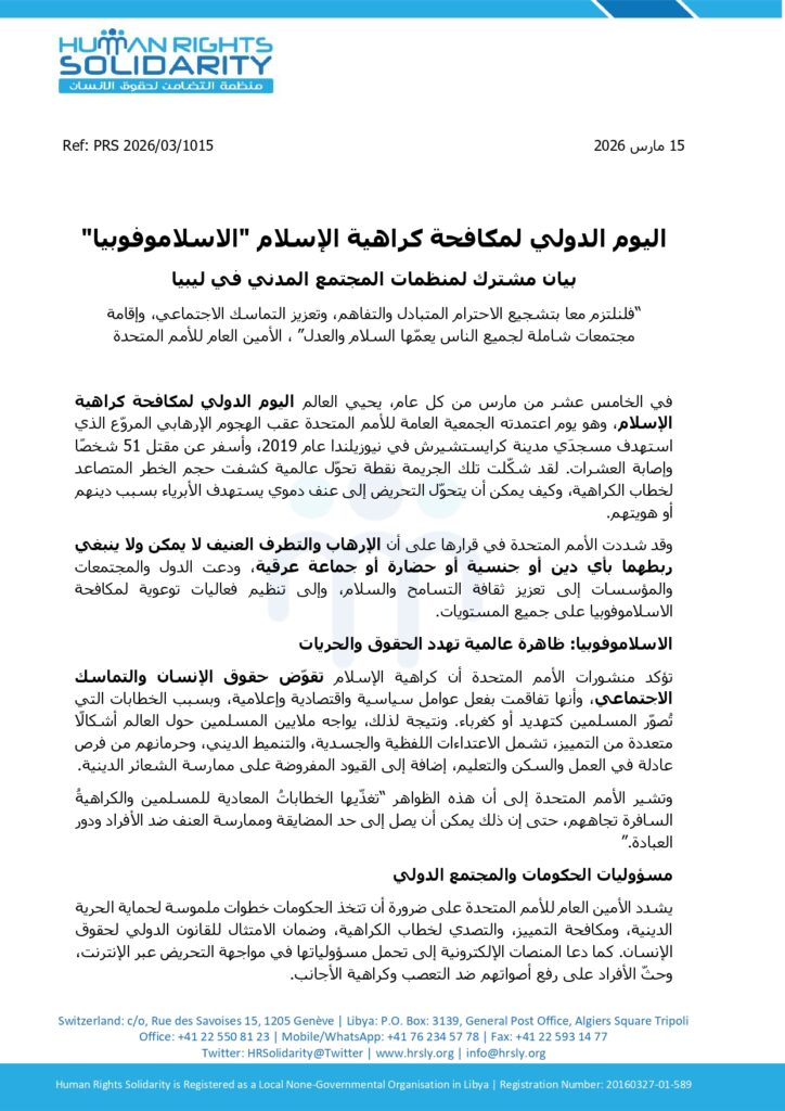 إن كراهية الإسلام ليست قضية تخص المسلمين وحدهم، بل هي تهديد مباشر لقيم المساواة والكرامة الإنسانية وسيادة القانون. وفي هذا اليوم الدولي، نجدد التزامنا بالعمل من أجل ليبيا يسودها الاحترام، ويُحمي فيها كل إنسان من التمييز والكراهية، أيًا كان دينه أو معتقده.