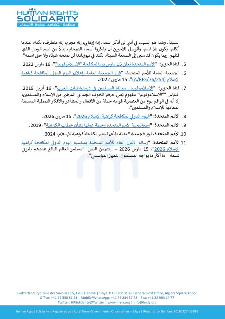 - الأمم المتحدة: “رسالة الأمين العام للأمم المتحدة بمناسبة اليوم الدولي لمكافحة كراهية الإسلام“، 15 مارس 2026.