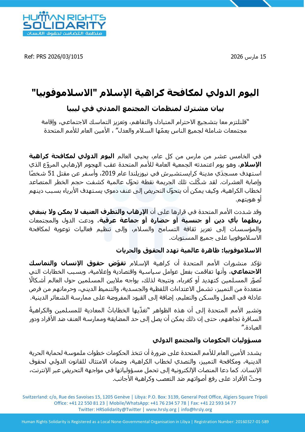 منظمات حقوقية ليبية تحيي اليوم الدولي لمكافحة كراهية الإسلام وتدعو إلى سياسات وطنية لمواجهة خطاب الكراهية