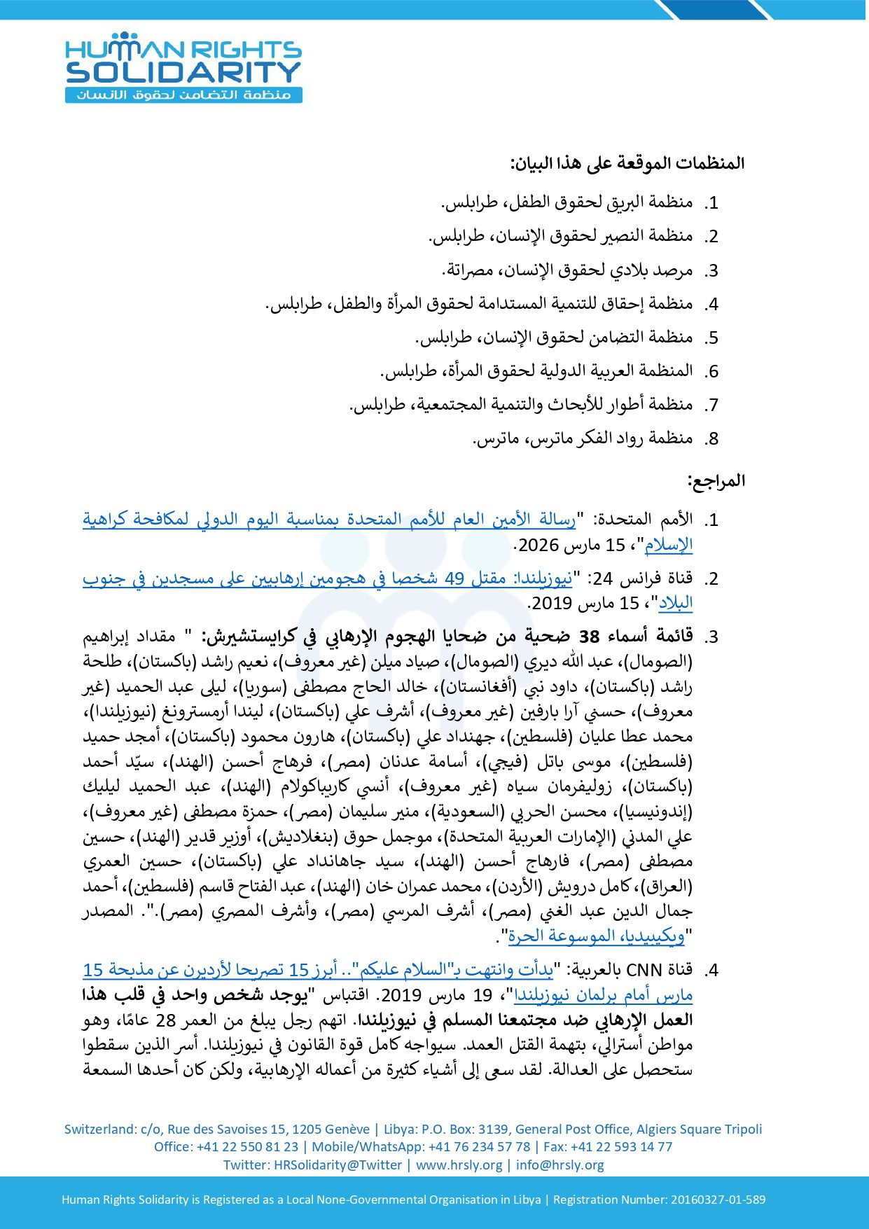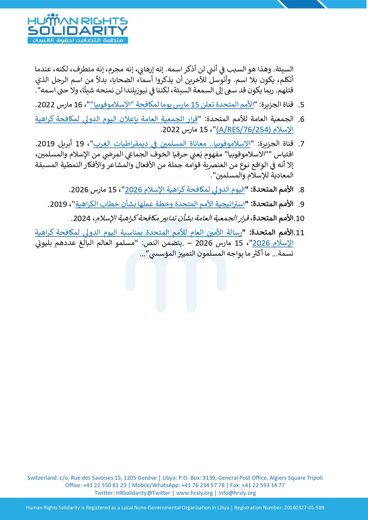 - الأمم المتحدة: “رسالة الأمين العام للأمم المتحدة بمناسبة اليوم الدولي لمكافحة كراهية الإسلام“، 15 مارس 2026.