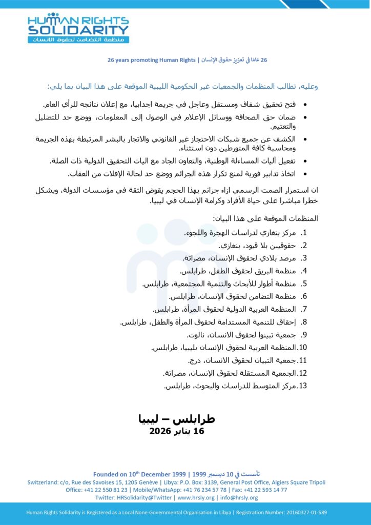 ان استمرار الصمت الرسمي ازاء جرائم بهذا الحجم يقوض الثقة في مؤسسات الدولة، ويشكل خطرا مباشرا على حياة الأفراد وكرامة الإنسان في ليبيا.