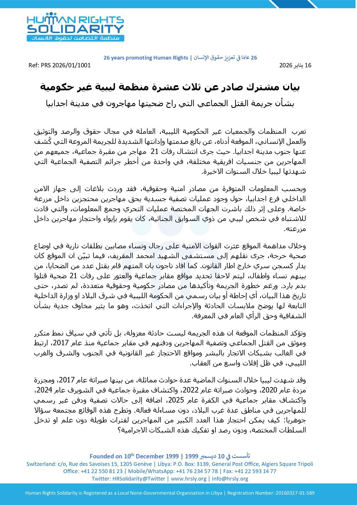 تعرب المنظمات والجمعيات غير الحكومية الليبية، العاملة في مجال حقوق والرصد والتوثيق والعمل الإنساني، الموقعة أدناه، عن بالغ صدمتها وإدانتها الشديدة للجريمة المروعة التي كُشف عنها جنوب مدينة اجدابيا. حيث جرى انتشال رفات 21 مهاجر من مقبرة جماعية، جميعهم من المهاجرين من جنسيات افريقية مختلفة، في واحدة من أخطر جرائم التصفية الجماعية التي شهدتها ليبيا خلال السنوات الاخيرة.