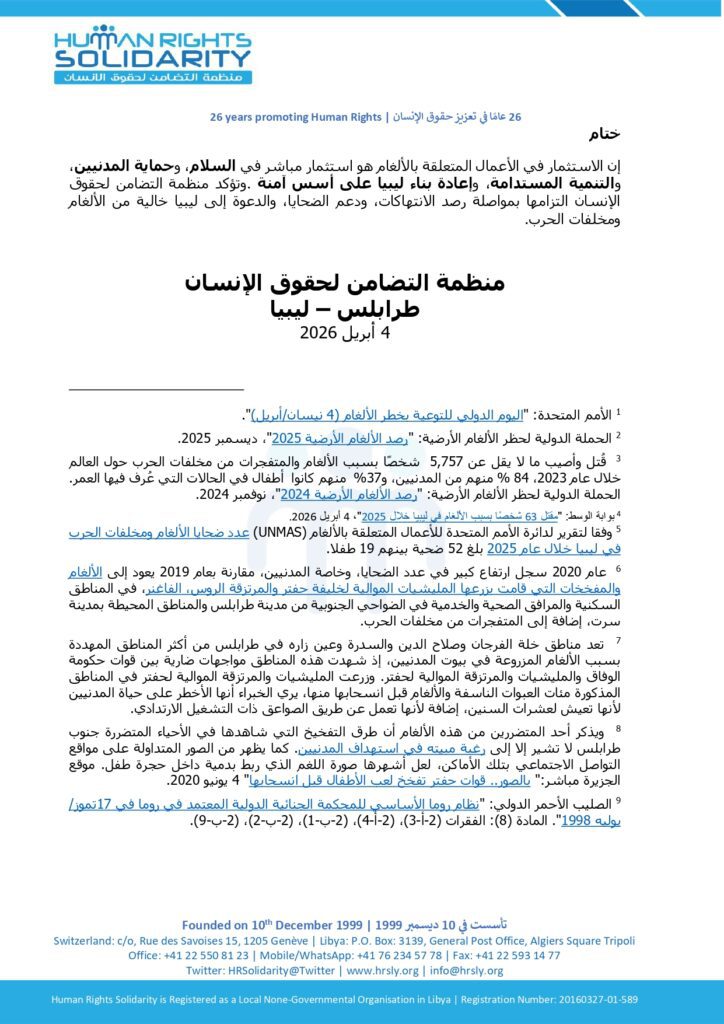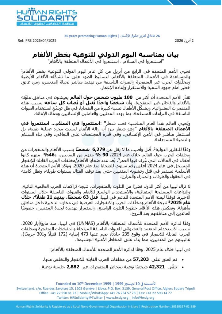 بمناسبة اليوم الدولي للتوعية بخطر الألغام، دعت منظمة التضامن لحقوق الإنسان إلى تكثيف الجهود الوطنية والدولية لمعالجة التلوث الواسع بالألغام ومخلّفات الحرب في ليبيا، مؤكدة أن الاستثمار في الأعمال المتعلقة بالألغام هو استثمار مباشر في السلام والأمن الإنساني.