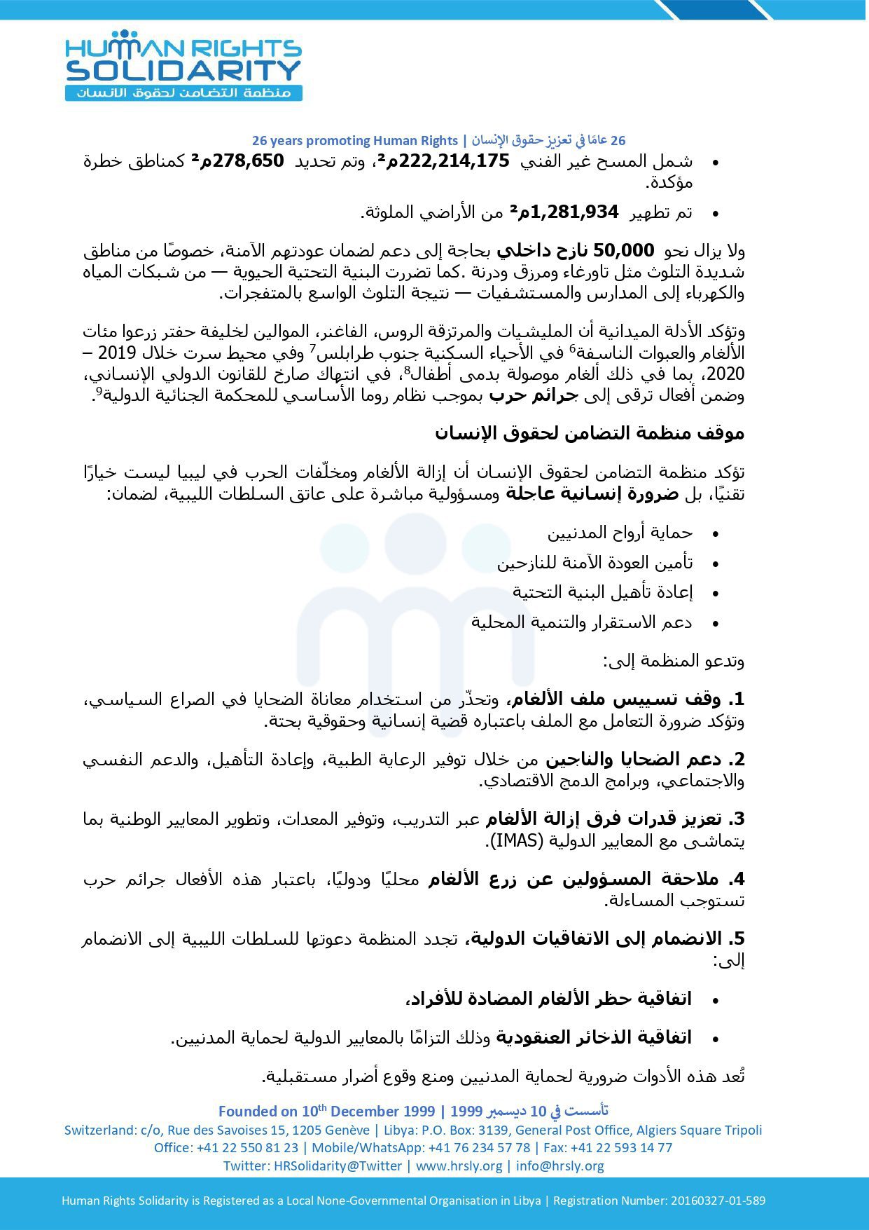 إن الاستثمار في الأعمال المتعلقة بالألغام هو استثمار مباشر في السلام، وحماية المدنيين، والتنمية المستدامة، وإعادة بناء ليبيا على أسس آمنة. وتؤكد منظمة التضامن لحقوق الإنسان التزامها بمواصلة رصد الانتهاكات، ودعم الضحايا، والدعوة إلى ليبيا خالية من الألغام ومخلفات الحرب.