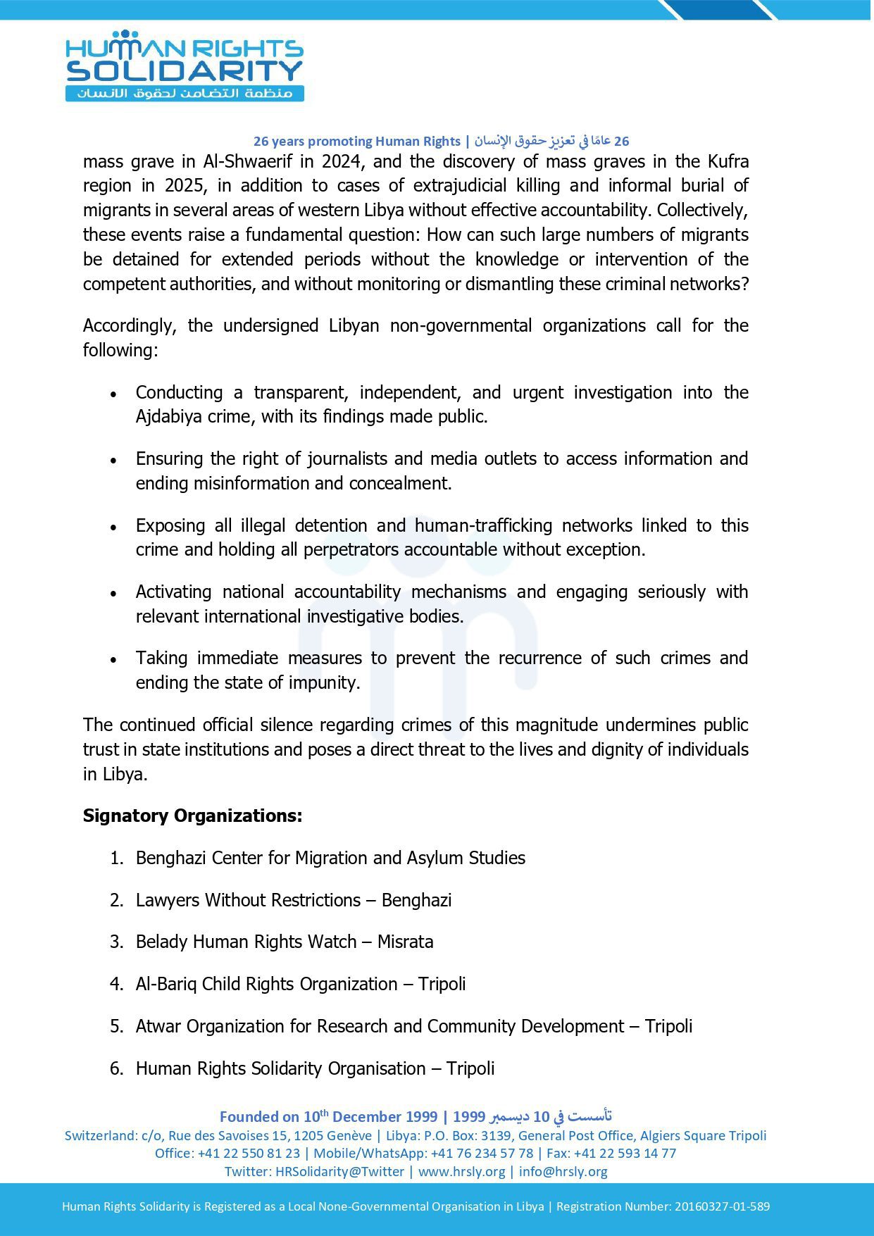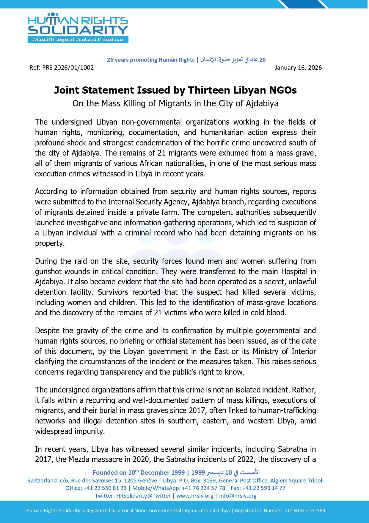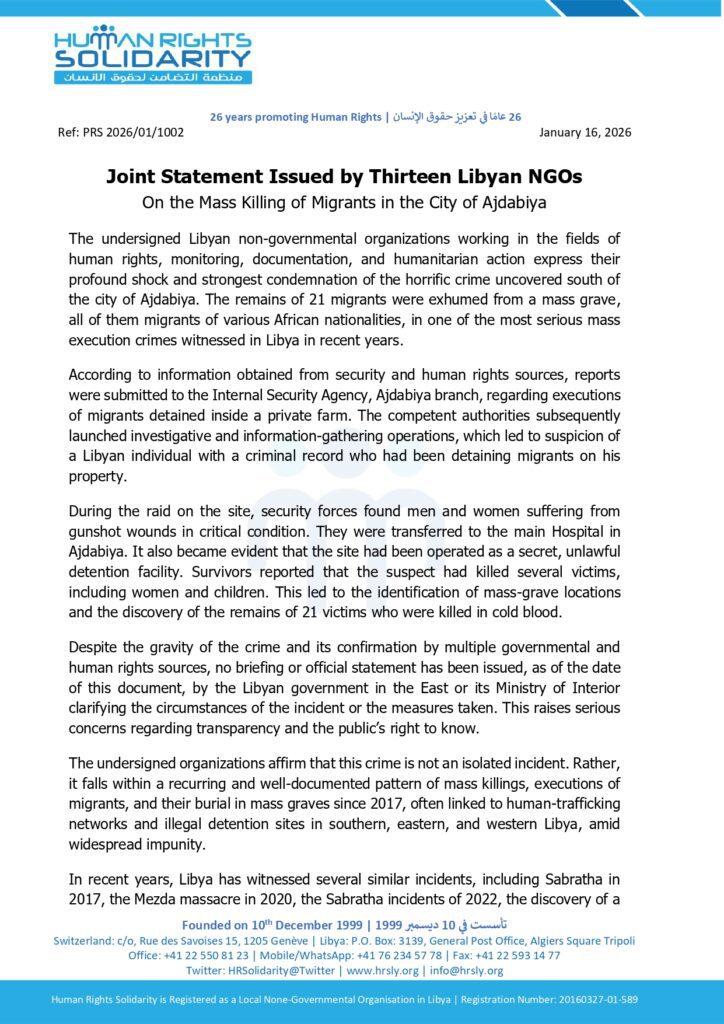 The undersigned Libyan non‑governmental organizations working in the fields of human rights, monitoring, documentation, and humanitarian action express their profound shock and strongest condemnation of the horrific crime uncovered south of the city of Ajdabiya. The remains of 21 migrants were exhumed from a mass grave, all of them migrants of various African nationalities, in one of the most serious mass execution crimes witnessed in Libya in recent years.